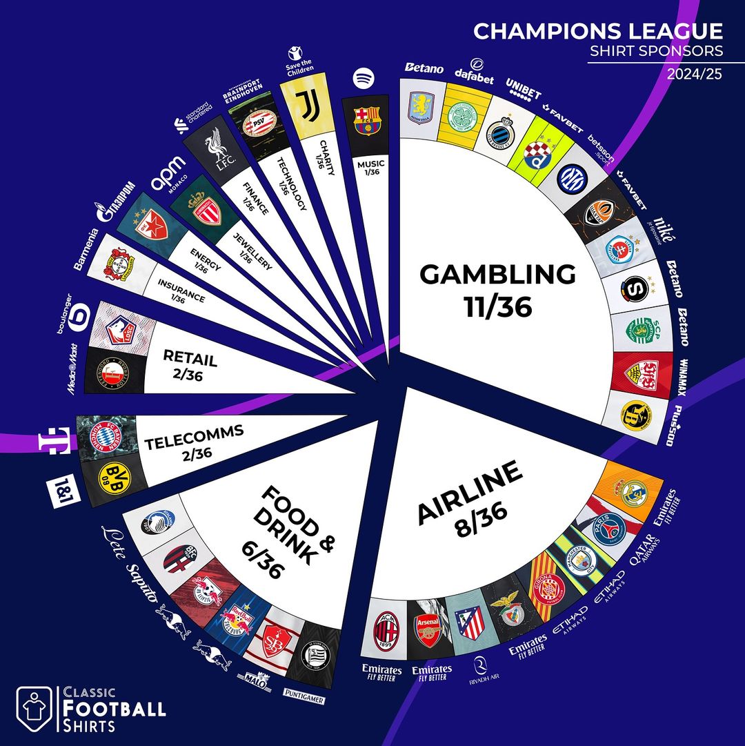2024/25 sezonunda 11 takım, forma göğüs sponsoru olarak bahis şirketleriyle anlaşmış durumda. Bu da, Şampiyonlar Ligi’ndeki takımların %30’unun bu sektörden destek aldığını gösteriyor. Bahis şirketleri, futbolda en yaygın sponsorlar arasında yer alıyor ve takımların gelir elde etmesine büyük katkıda bulunuyor.