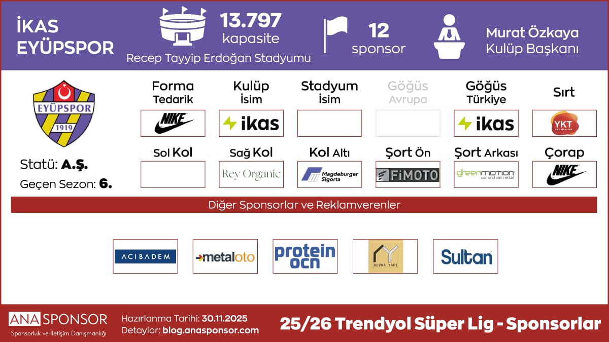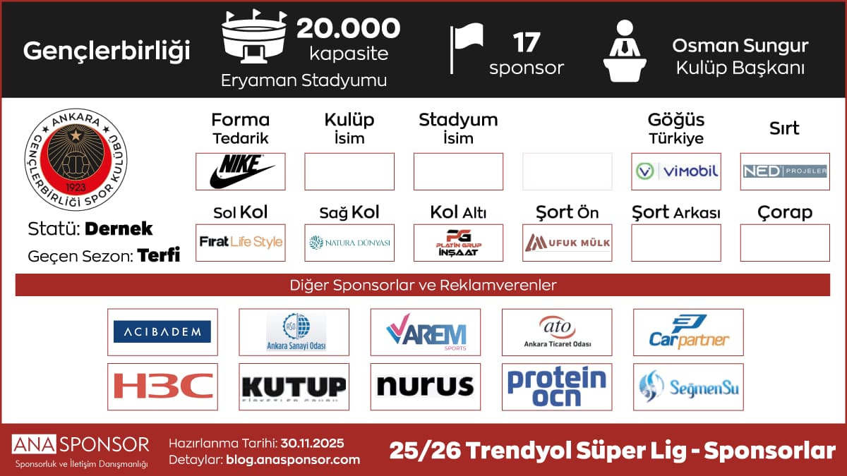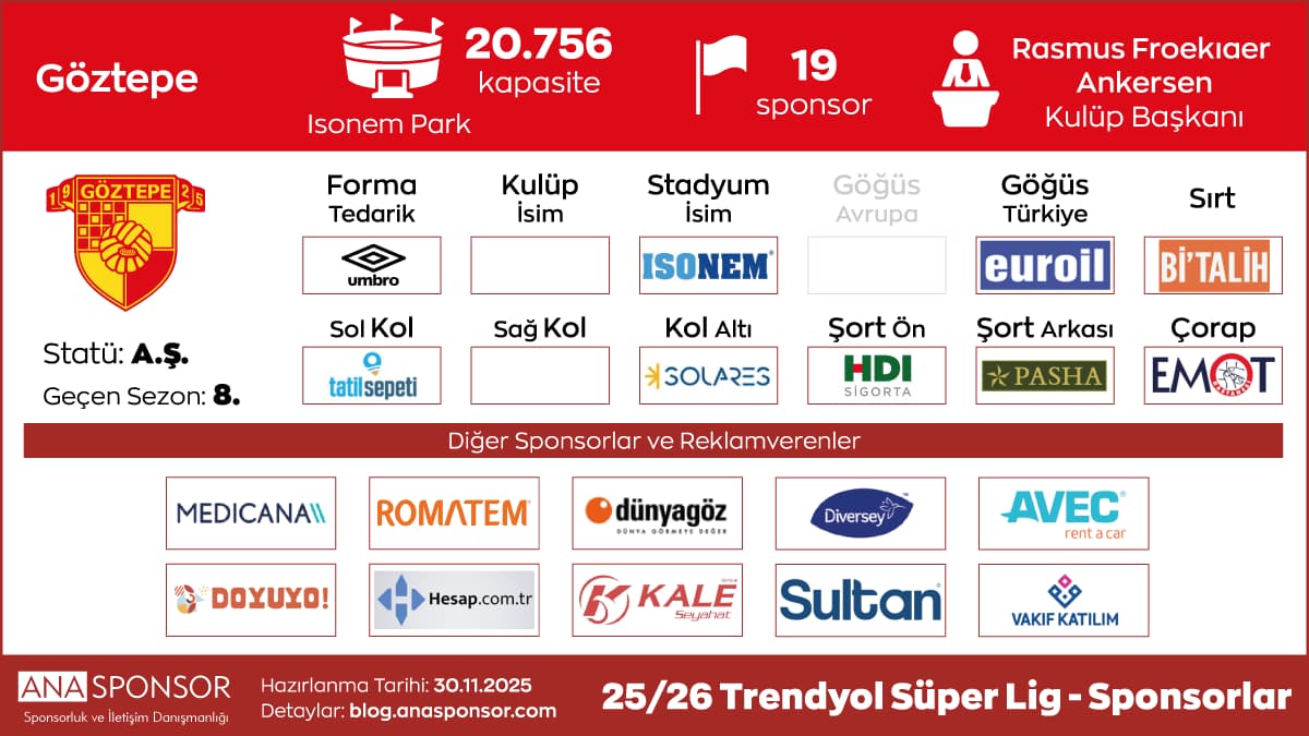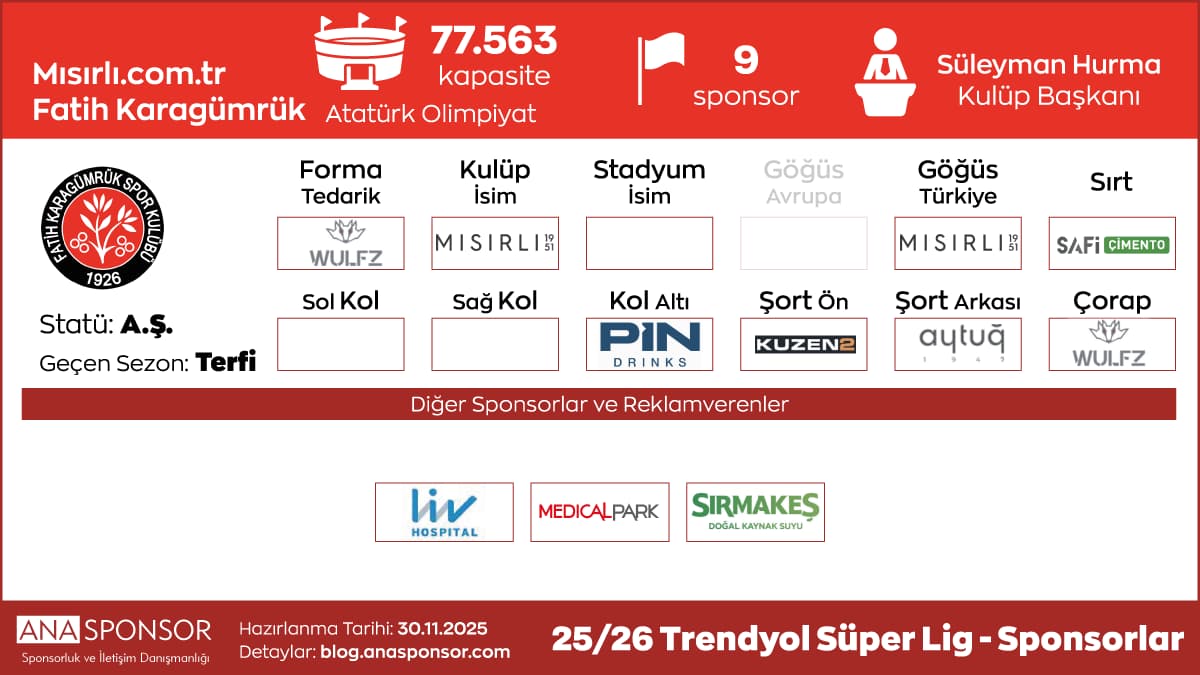 - Sırt Sponsoru: Karaarslan İnşaat (Ocak 2026’da başladı ve 2025-26 sezonu sonuna kadar devam edecek. Eski sponsor Safi Çimento ile Kasım 25’te başlayan anlaşma 1 yılın sonunda sona erdi).