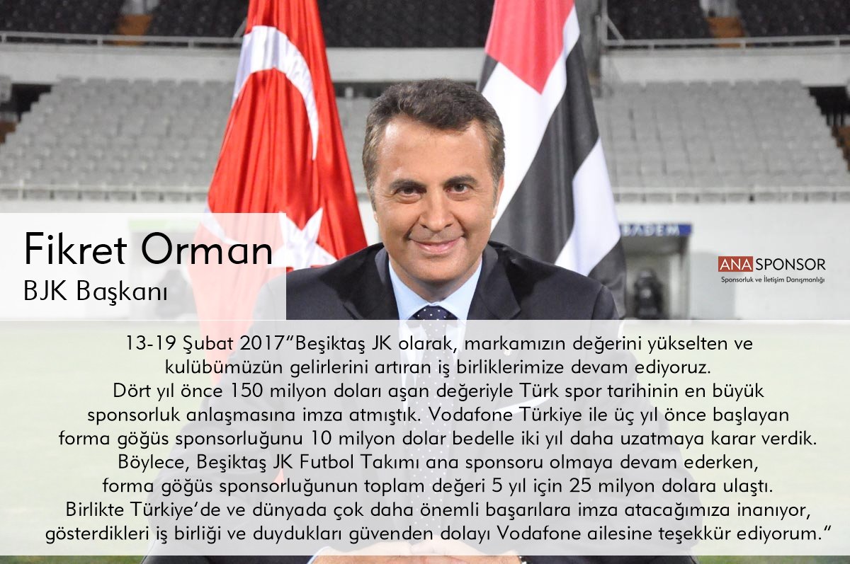 - Beşiktaş JK Başkanı Fikret Orman: “Gösterdikleri iş birliği ve duydukları güvenden dolayı Vodafone ailesine teşekkür ediyorum.”