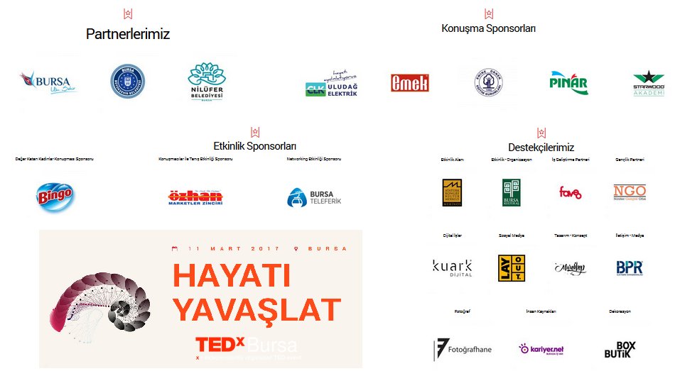 - TEDx Bursa, 11 Mart’ta Merinos Atatürk Kongre ve Kültür Merkezi’nde düzenlenecek. İşte tüm sponsorlar.