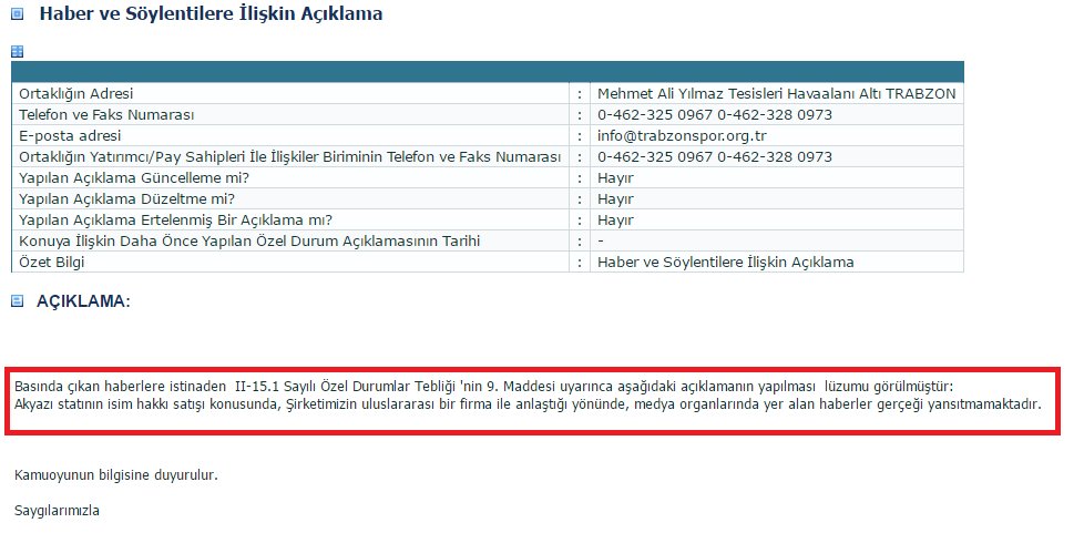 - Trabzonspor, stadyum isim sponsorluğu için Emirates ile anlaşıldığı haberlerini KAP üzerinden yalanladı.