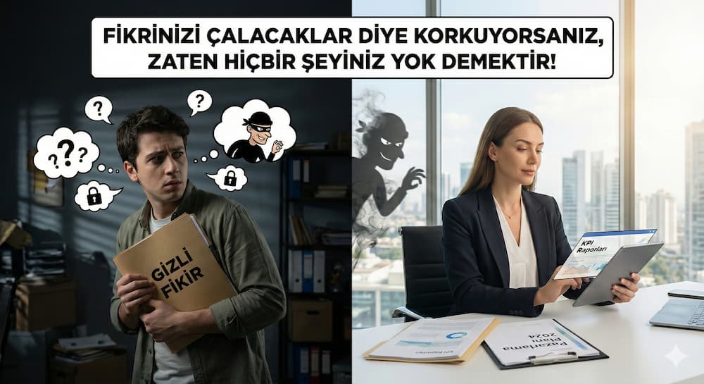 Fikrinizi çalacaklarından korkuyorsanız, muhtemelen masaya henüz bir “iş” koymamışsınızdır. Projesine gerçekten inanan, sahada olmayı göze alan, risk alan insanlar “çalınır mı?” diye takılı kalmaz.
